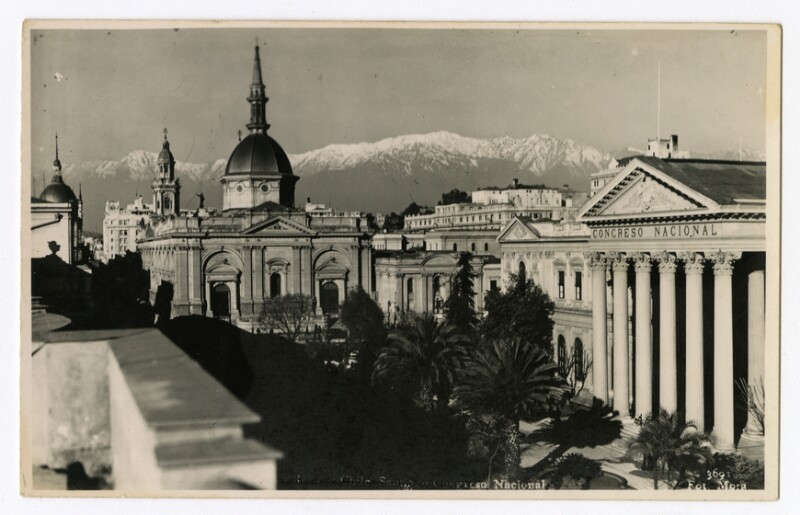 Chile, Santiago Congreso Nacional : [Vista parcial del edificio y jardines del ex Congreso Nacional, calle Compañía, y vista posterior de la Catedral de Santiago, calle Bandera y, otros] [fotografía] Fot. Mora.