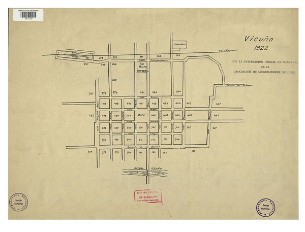 Plano de la ciudad de Curicó con la numeración oficial de las manzanas [material cartográfico] : de la Asociación Chilena de Aseguradores contra Incendio.