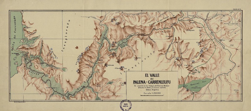 Las Cordilleras en torno a las hoyas hidrográficas de los ríos Cisnes y Aysén [material cartográfico] diseñada por el Dr. Hans Steffen, de acuerdo con los trabajos y mediciones de la Comisión Límitrofe Chilena (C. Barrios) y de la Marina (E.Simpson).