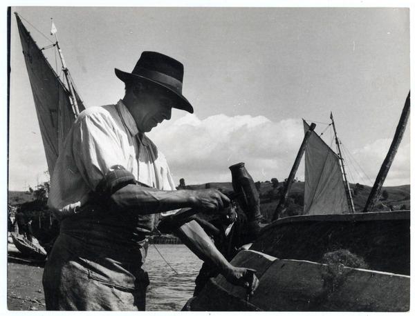 [Trabajador junto a una embarcación] [fotografía] Domingo Ulloa.