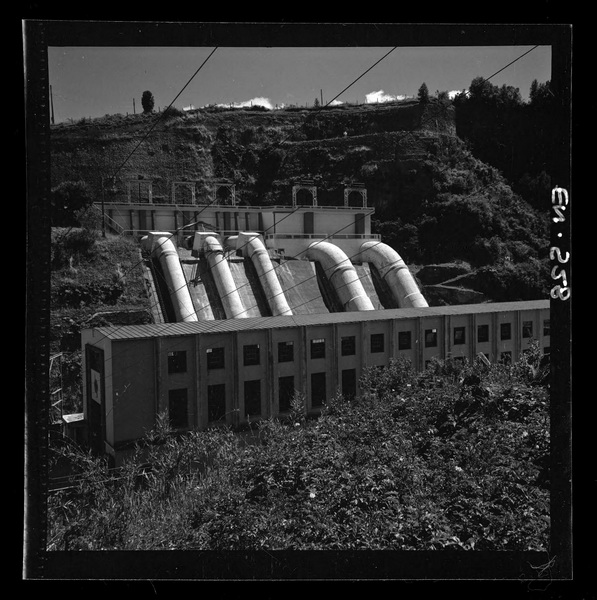 Aspectos de la central y su entorno : edificio de 10.000 m2 y las 5 tuberías de 52 m. de longitud, 3 de ellas tienen 2,30 m. de diámetro y las restantes 3,70 m. diámetro [fotografía] Luis Ladrón de Guevara.