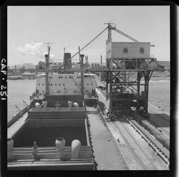 [Carbón conducido por la cinta transportadora hasta el cargador móvil, instalado en el muelle de embarque] [fotografía] Ignacio Hochhäusler.
