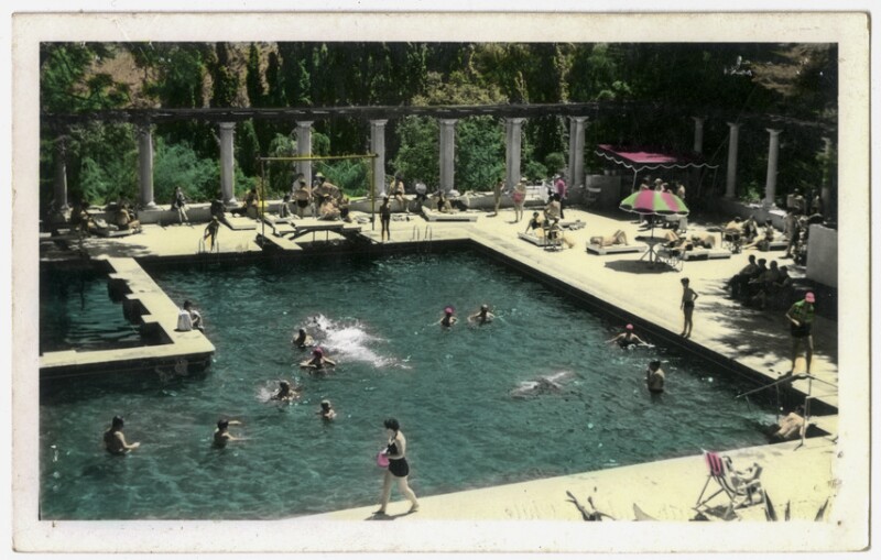 Zapallar: Castillo Casanova, años 50; en primer plano, la pila del ganso, réplica en yeso (perdida), atrás, en puente levadizo, cañon colonial (robado) [fotografía].