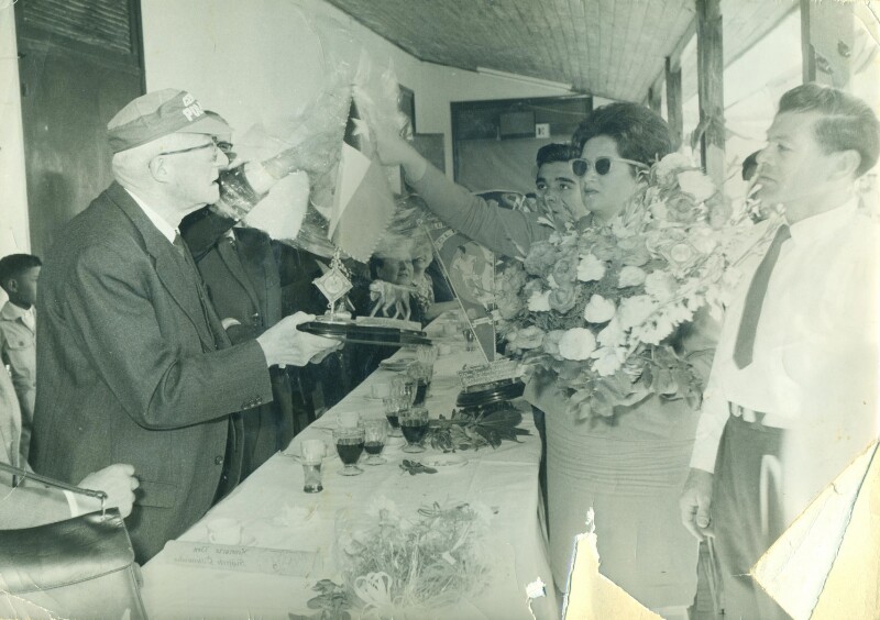 [Siegfried Gildemeister junto a su esposa en ceremonia en Cerro Blanco] [Fotografía].