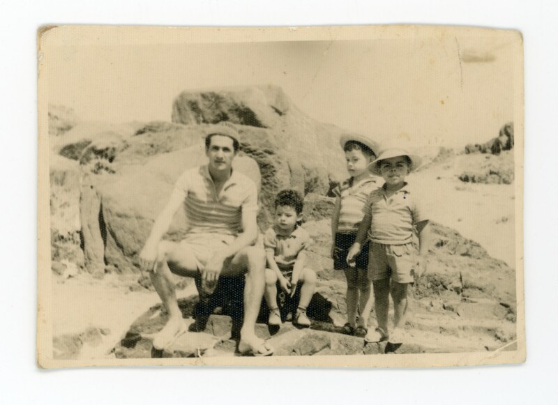 [Un adulto y tres niños de paseo en la playa] [Fotografía].