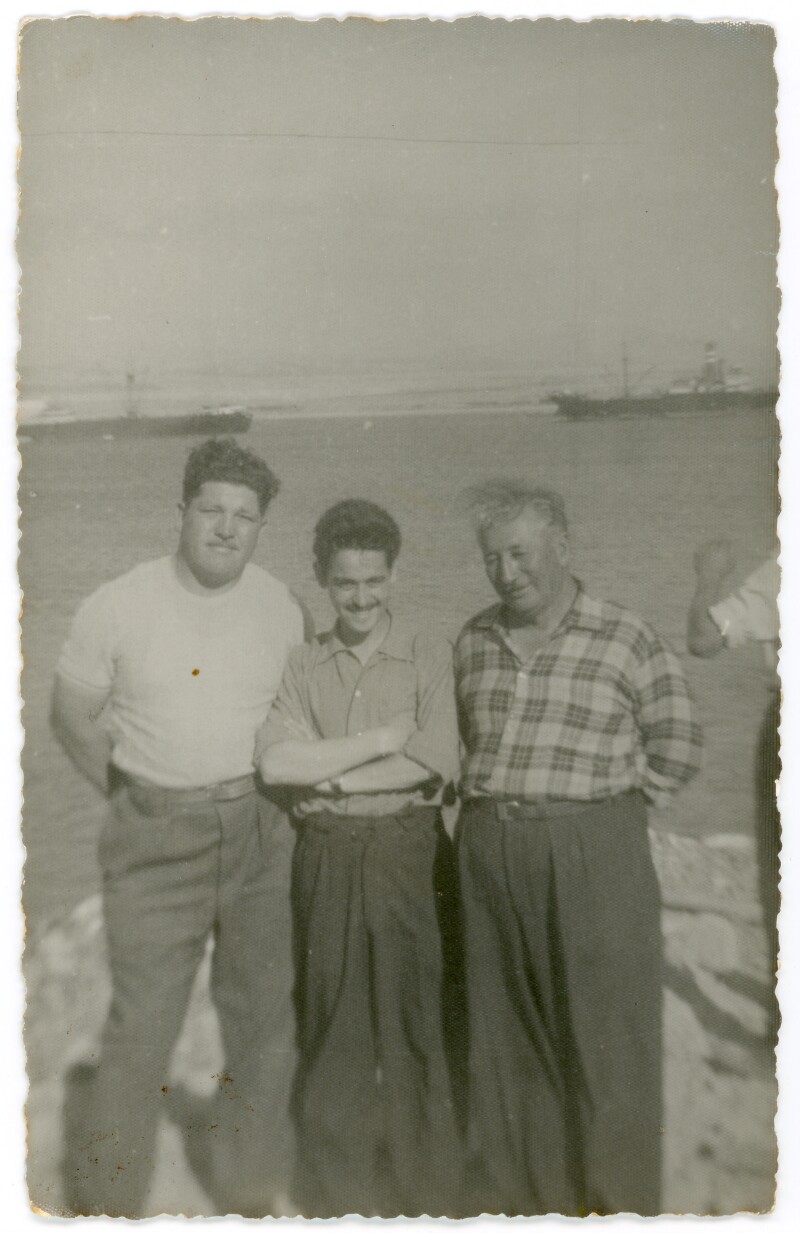[Tres hombres de pie en la costa de Caldera] [Fotografía].