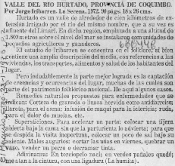 Autores chilenos - Valle del río Hurtado, provincia de Coquimbo - Iribarren Charlin, Jorge