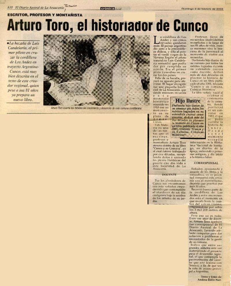 Arturo Toro, el historiador de Cunco [artículo] Andrea Riffo Nur.
