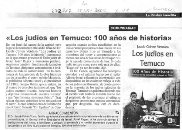 Los Judíos en Temuco: 100 años de historia. [artículo]