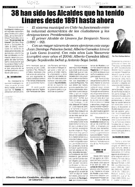 38 han sido los alcaldes que ha tenido Linares desde 1891 hasta ahora [artículo] Raúl Balboa Ibáñez.
