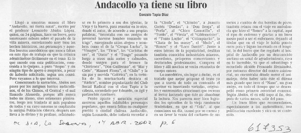 Andacollo ya tiene su libro [artículo] Gonzalo Tapia Díaz
