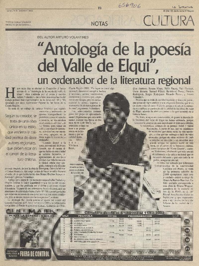 "Antología de la poesía del Valle de Elqui", un ordenador de la literatura regional. [artículo] Jorge Guzmán.