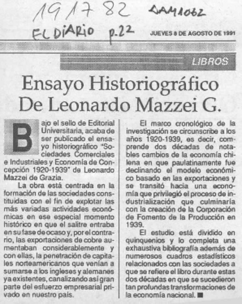 Ensayo historiográfico de Leonardo Mazzei G. [artículo].