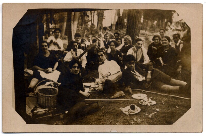 [Los estándartes de la Asociación de Nativos de Arica y Sociedad Chilena de Socorros Mutuos y sus miembros en el almuerzo campestre ofrecido por la Asociación de Nativos por motivo de la bendición de su estándarte] [fotografía]