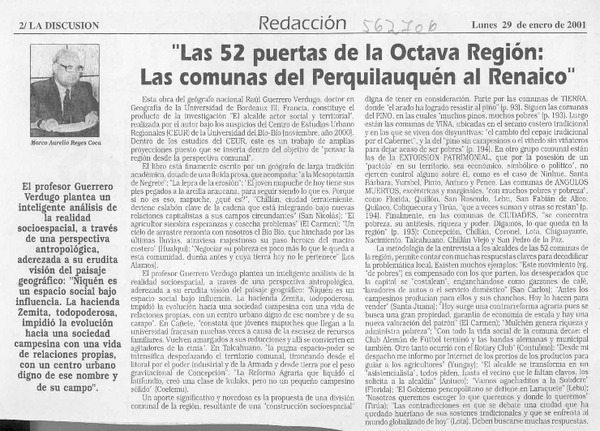 "Las 52 puertas de la Octava Región, las comunas del Perquilauquén al Renaico" [artículo] Marco Aurelio Reyes Coca