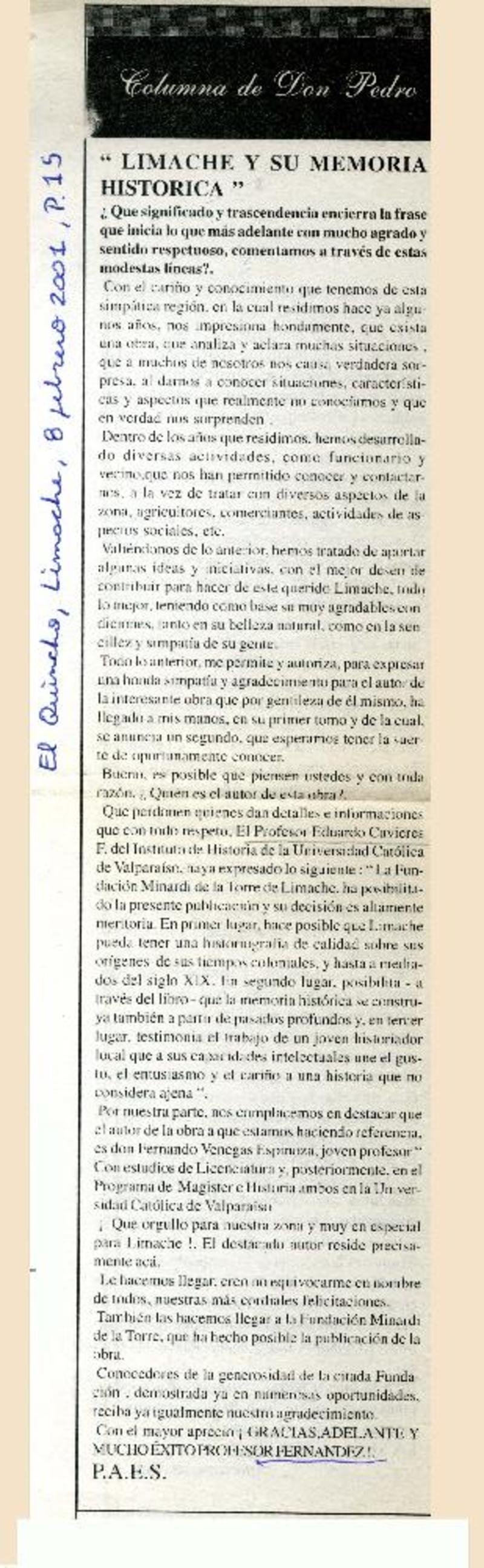 "Limache y su memoria histórica" [artículo] P.A.E.S.