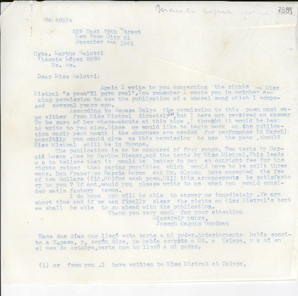 [Carta] 1951 dic. 8, New York [a] Martha Salotti, Buenos Aires [manuscrito] Joseph Magnus Goodman.