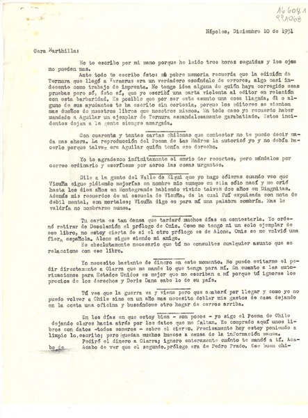 [Carta] 1951 dic. 10, Nápoles, [Italia] [a la] Cara Marthilla [manuscrito] Gabriela [Mistral].