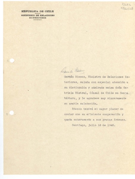 [Carta] 1948 jul. 16, República de Chile, Ministerio de Relaciones Exteriores, Santiago, Chile [a] Doña Gabriela Mistral, Cónsul de Chile en Santa Bárbara, [EE.UU.] [manuscrito] Germán Riesco.