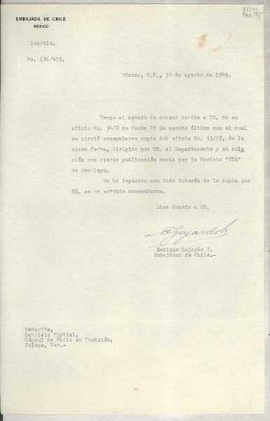 [Oficio] N° 656423, 1949 ago. 30, México, D.F., México [a la] Señorita, Gabriela Mistral, Cónsul de Chile en Comisión, Jalapa, Ver., [México] [manuscrito] / Enrique Gajardo V. Embajador de Chile.