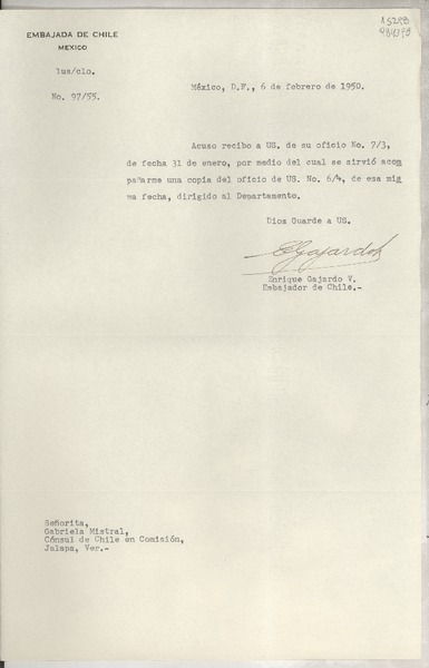 [Oficio] N° 9755, 1950 feb. 6, México, D.F., México [a la] Señorita, Gabriela Mistral, Cónsul de Chile en Comisión, Jalapa, Ver., [México] [manuscrito] / Enrique Gajardo V. Embajador de Chile.