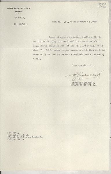 [Oficio] N° 9856, 1950 feb. 6, México, D.F., México [a la] Señorita, Gabriela Mistral, Cónsul de Chile en Comisión, Jalapa, Ver., [México] [manuscrito] / Enrique Gajardo V. Embajador de Chile.