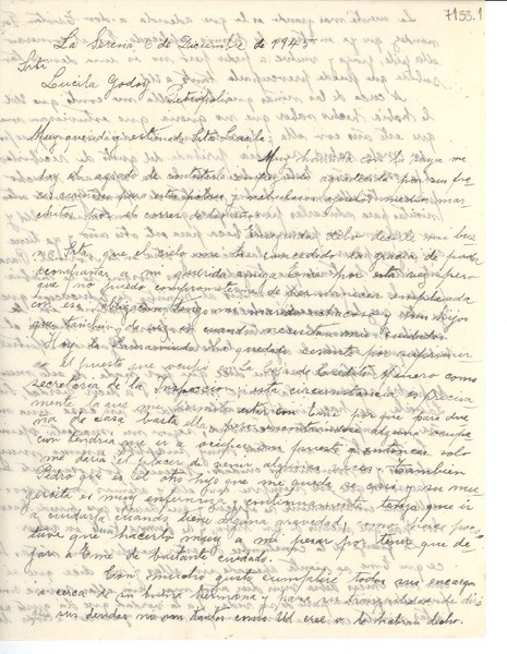 [Carta] 1945 dic. 6, La Serena [a] Gabriela Mistral [manuscrito] Cristobalina Trujillo.