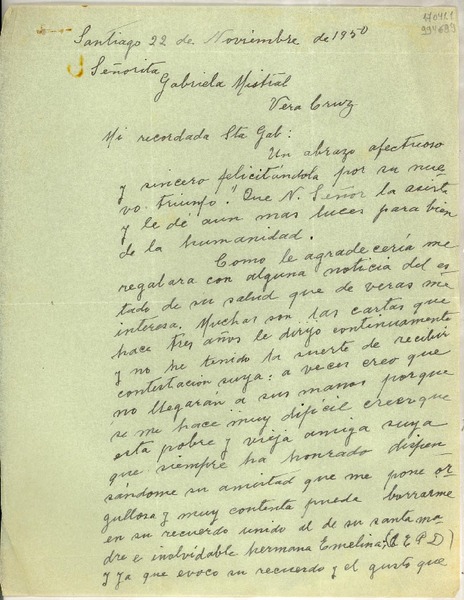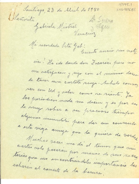 [Carta] 1950 abr. 23, Santiago, [Chile] [a] Gabriela Mistral, Veracruz, [México] [manuscrito] Cristo.