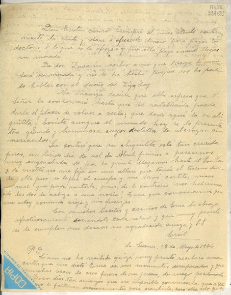 [Carta] 1946 mayo 18, La Serena [a] Gabriela Mistral [manuscrito] C. T. de Ramírez.