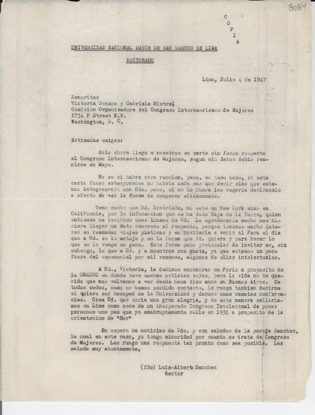 [Carta] 1947 jul. 4, Lima [a] Gabriela Mistral y Victoria Ocampo, Washington D. C. [manuscrito] Luis Alberto Sánchez.