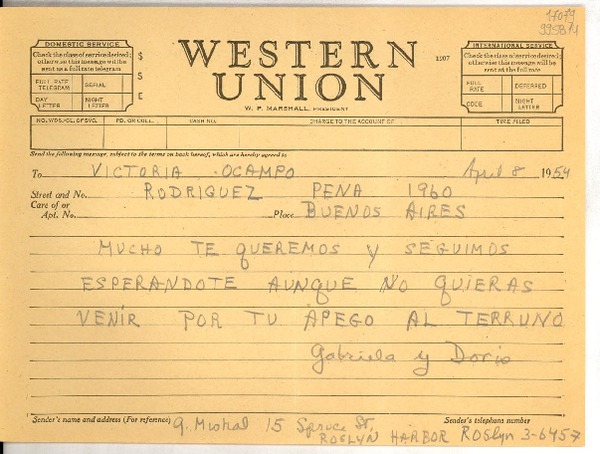 [Telegrama] 1954 abr. 8, Roslyn Harbor, new York [a] Victoria Ocampo, Buenos Aires [manuscrito] Gabriela y Doris