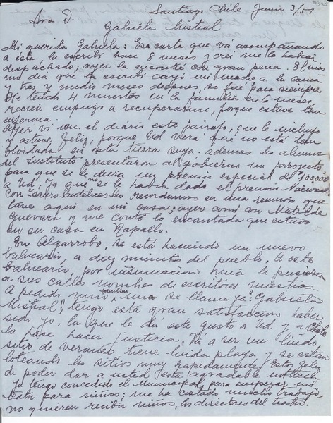 [Carta] 1951 jun. 3, Santiago, [Chile] [a] Gabriela Mistral [manuscrito] Patricia Morgan.