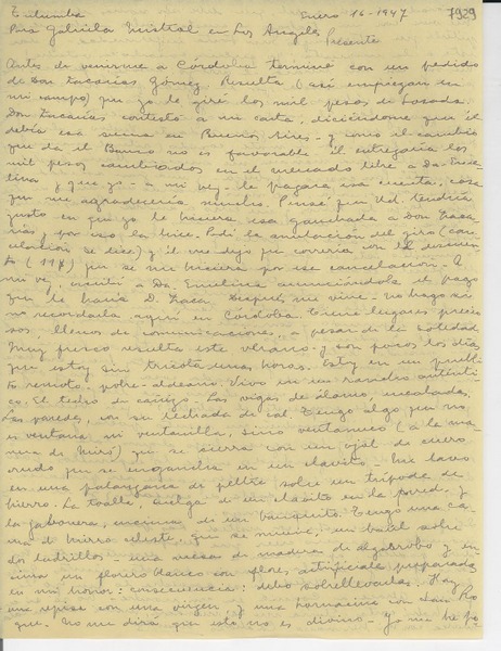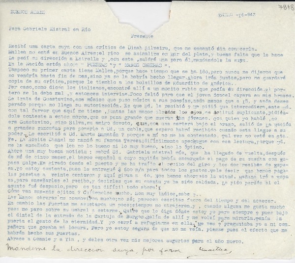 [Carta] 1943 ene. 16, Buenos Aires, [Argentina] [a] Gabriela Mistral, Río [de Janeiro, Brasil] [manuscrito] Martha [Salotti].
