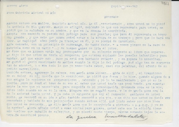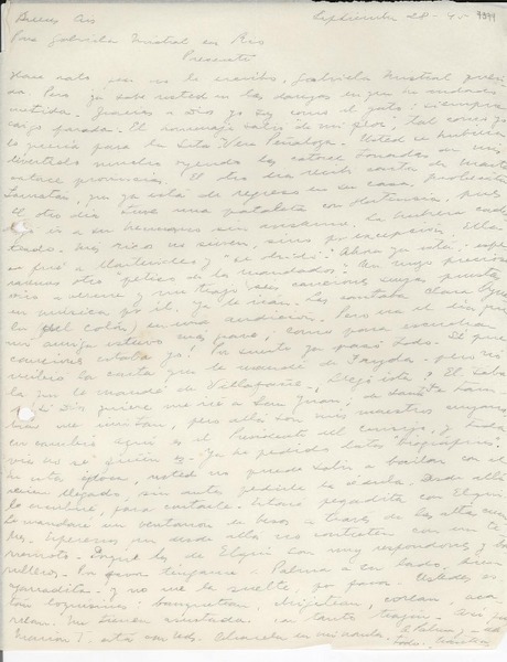 [Carta] 1943 sept., Buenos Aires, [Argentina] [a] Gabriela Mistral, Río, [Brasil] [manuscrito] Martha Salotti.