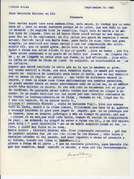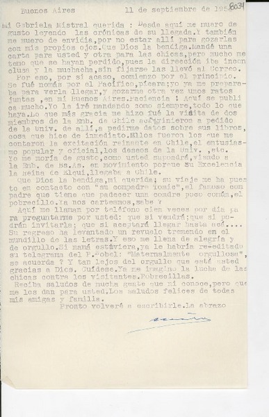 [Carta] 1943 sept. 26, Buenos Aires, [Argentina] [a] Gabriela Mistral, Rio, [Brasil] [manuscrito] Martha Salotti.