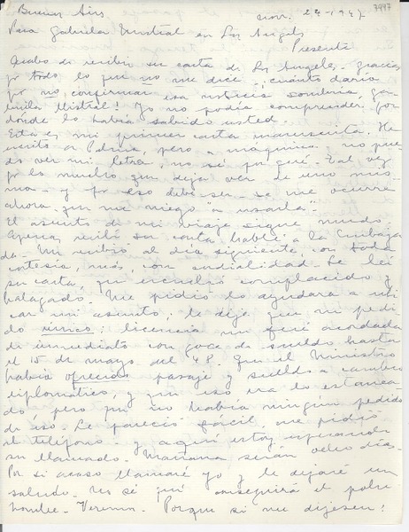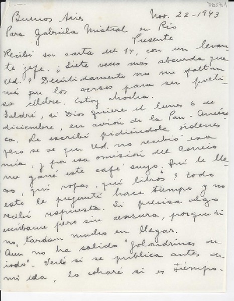 [Carta] 1943 nov. 22, Buenos Aires, [Argentina] [a] Gabriela Mistral, Río [de Janeiro, Brasil] [manuscrito] Martha A. Salotti.