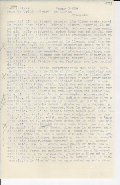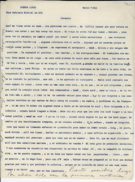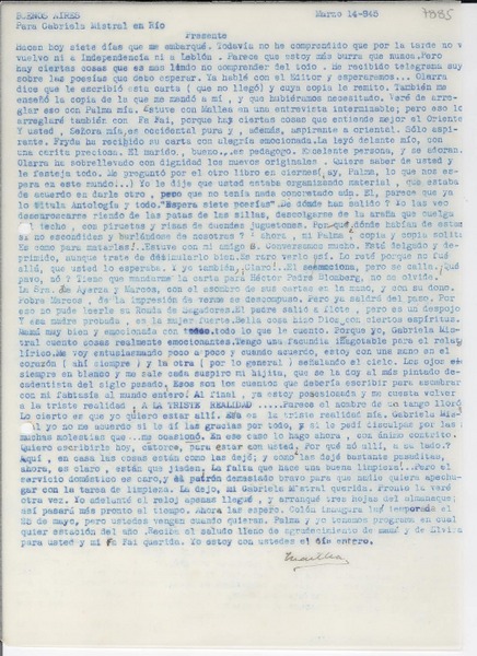 [Carta] 1944 mar. 7, Buenos Aires, [Argentina] [a] Gabriela Mistral, Río, [Brasil] [manuscrito] Martha Salotti.