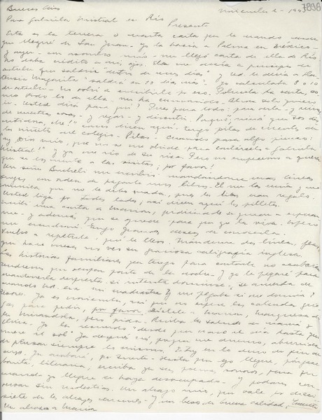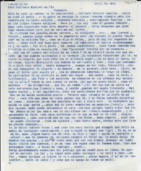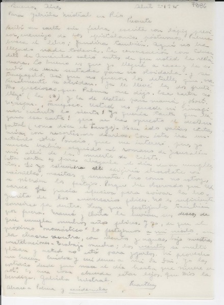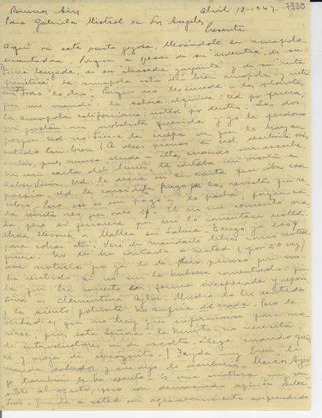 [Carta] 1944 abr. 2, Buenos Aires, [Argentina] [a] Gabriela Mistral, Río, [Brasil] [manuscrito] Martha [Salotti].