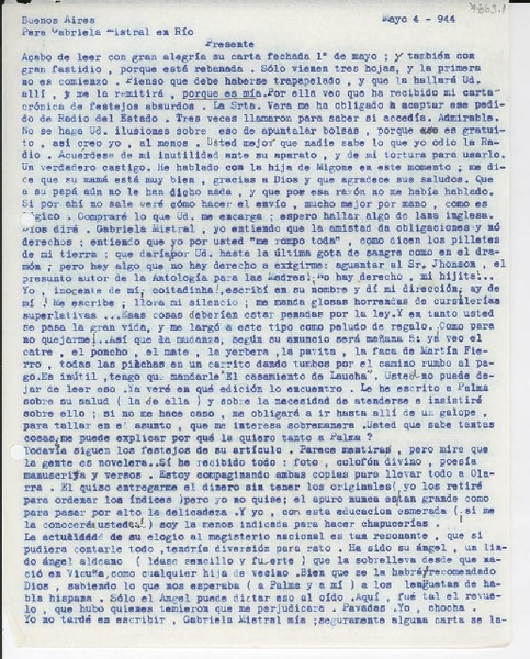 [Carta] 1944 mayo 4, Buenos Aires, [Argentina] [a] Gabriela Mistral, Río, [Brasil] [manuscrito] Martha [Salotti].