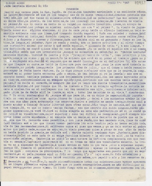 [Carta] 1942 jun. 2, Buenos Aires [a] Gabriela Mistral, Río [de Janeiro] [manuscrito] Martha [Salotti].