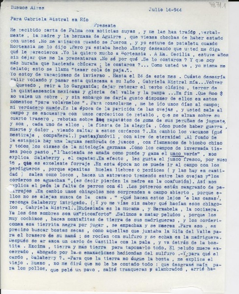 [Carta] 1944 jul. 14, Buenos Aires, [Argentina] [a] Gabriela Mistral, Rio, [Brasil] [manuscrito] Martha [Salotti].