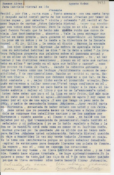 [Carta] 1944 ago. 5, Buenos Aires, [Argentina] [a] Gabriela Mistral, Río, [Brasil] [manuscrito] Martha A. Salotti.