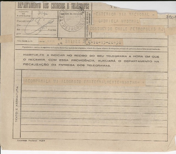 [Telegrama] 1945 nov. 16, Buenos Aires [a] Gabriela Mistral, Petrópolis [manuscrito] Martha [Salotti].