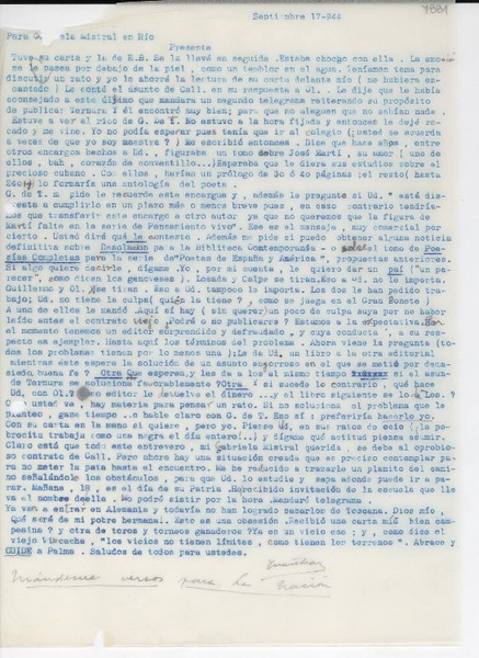 [Carta] 1944 sept. 17, Buenos Aires, [Argentina] [a] Gabriela Mistral, Río, [Brasil] [manuscrito] Martha [Salotti].