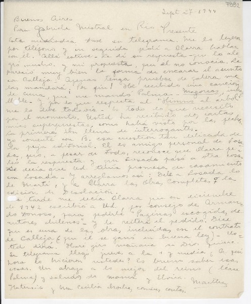 [Carta] 1944 sept. 27, Buenos Aires, [Argentina] [a] Gabriela Mistral, Rio, [Brasil] [manuscrito] Martha [Salotti].