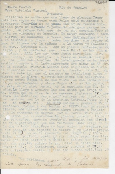 [Carta] 1945 ene. 24, Río de Janeiro, [Brasil] [a] Gabriela Mistral [manuscrito] Martha [Salotti].