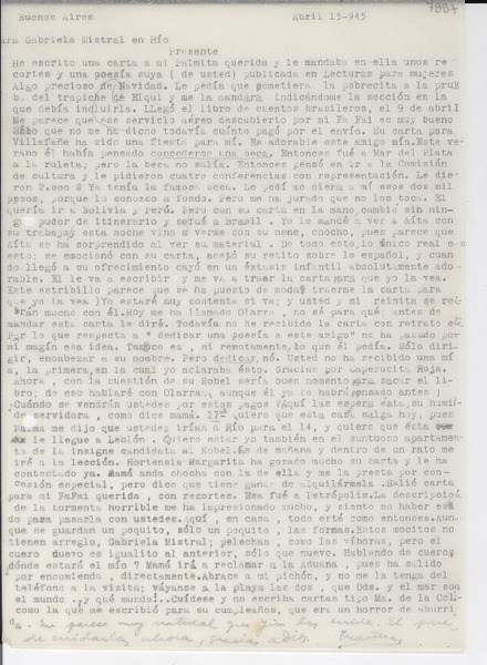 [Carta] 1945 abr. 15, Buenos Aires, [Argentina] [a] Gabriela Mistral, Río [de Janeiro, Brasil] [manuscrito] Martha S[alotti].