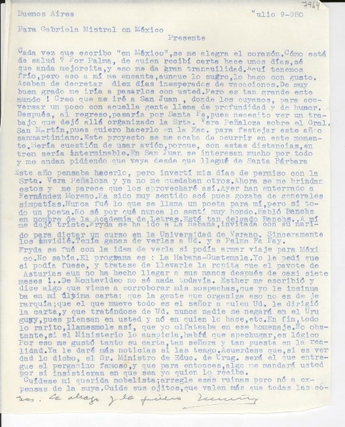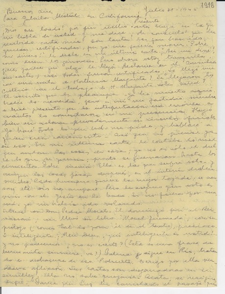 [Carta] 1946 jul. 31, Buenos Aires [a] Gabriela Mistral, California [manuscrito] Martha [Salotti].