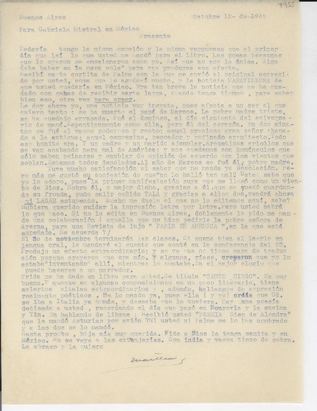 [Carta] 1953 oct. 7, Buenos Aires, [Argentina] [a] Gabriela Mistral, Roslyn Harbor, Long Island, [EE.UU.] [manuscrito] Martha S[alotti].
