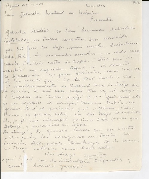 [Carta] 1945 ago. 7, Buenos Aires, [Argentina] [a] Gabriela Mistral, Río [de Janeiro, Brasil] [manuscrito] Martha S[alotti].